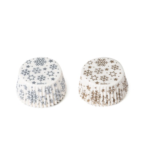 Caissettes à cupcakes, parfaites pour la période de Noël avec de beaux motifs flocons or & argent.