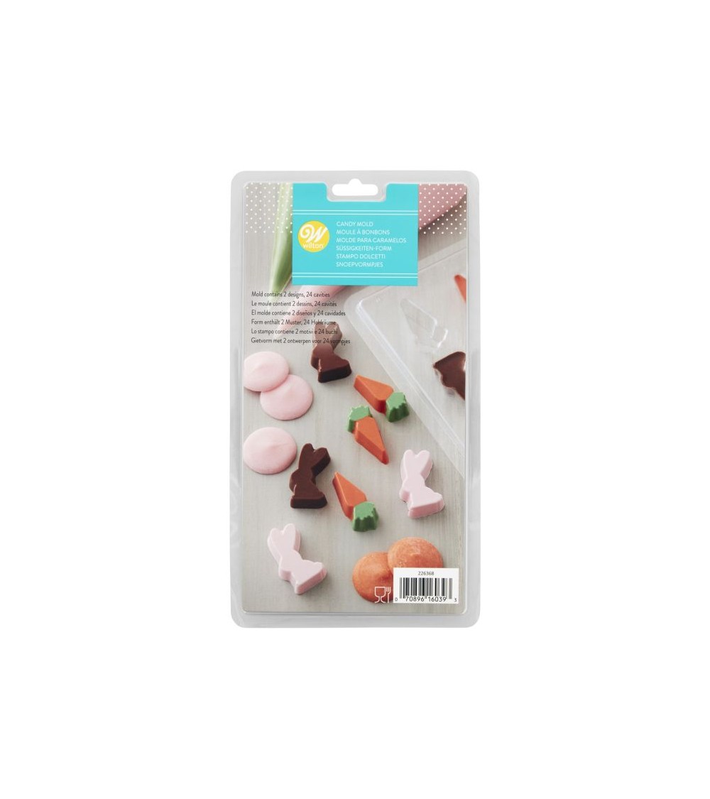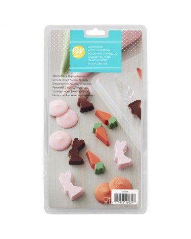 Réalisez de délicieuses friandises de Pâques avec le moule à bonbons Wilton Mini Lapin & Carotte. Idéal pour créer des bonbons en forme de lapin et de carotte avec du chocolat, des candy melts ou deco melts pastel.